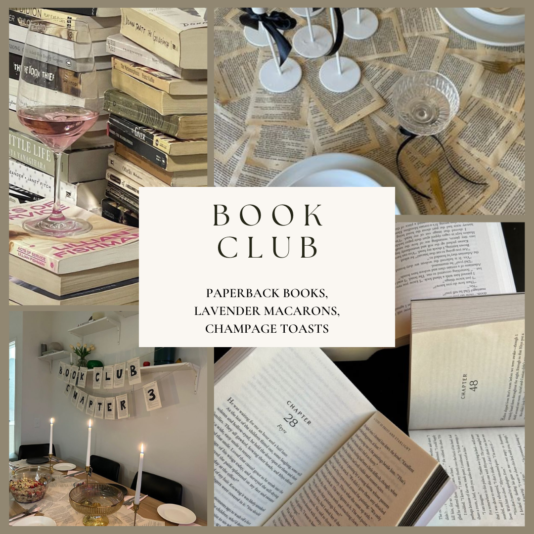 Imagine the cozy camaraderie of a book club, a group of kindred spirits gathered around a dinner table, laughter mingling with the sweet aroma of lavender macaron cookies, champagne bottles popping in joyous celebration, their effervescence matching the sparkle of shared stories and lively debates, a stack of well-loved paperback books sprawled across the table, each page a gateway to new worlds and meaningful discussions, the essence of a safe space where words flow freely, friendships deepen, and every moment is a reason to celebrate.