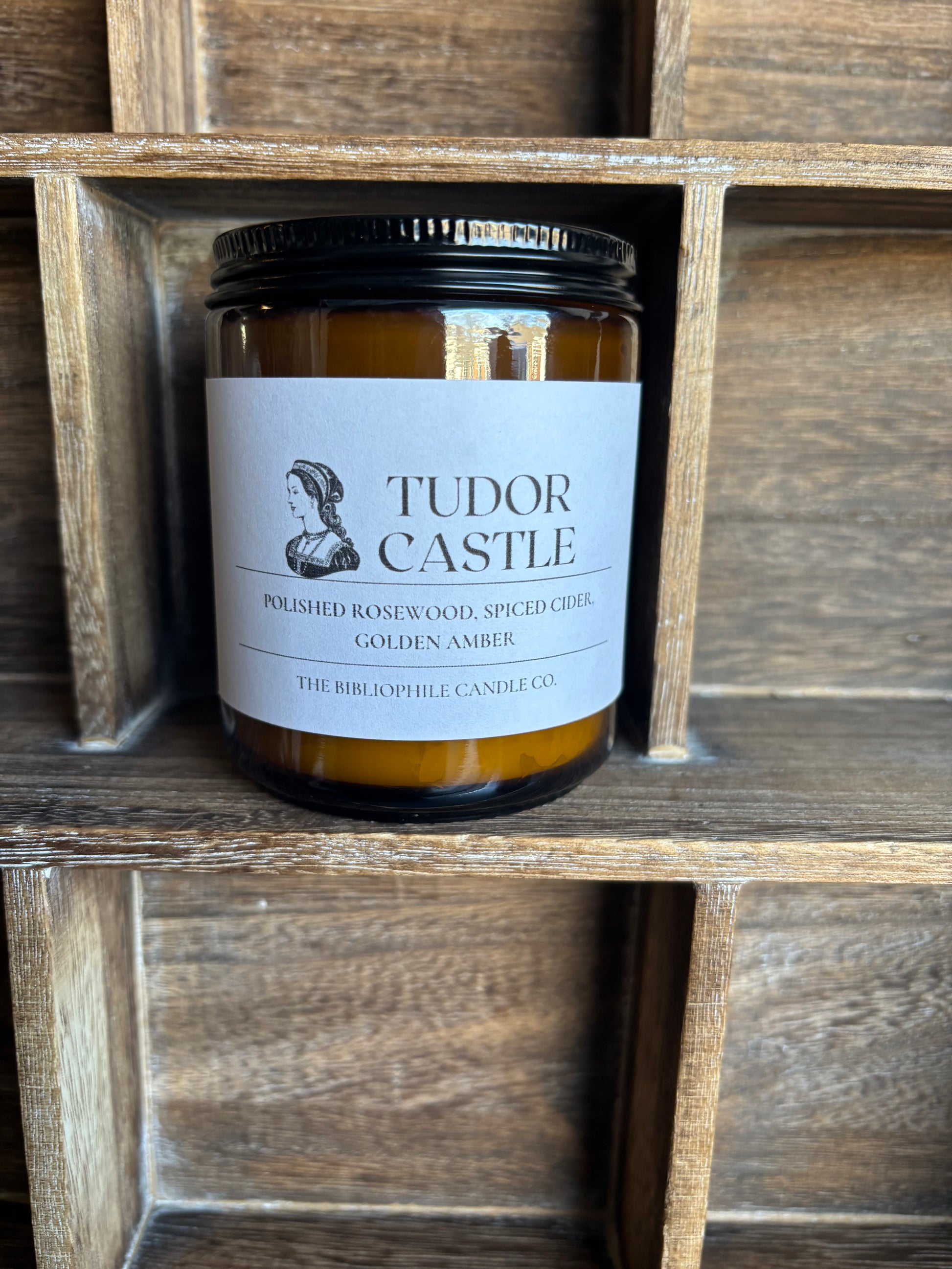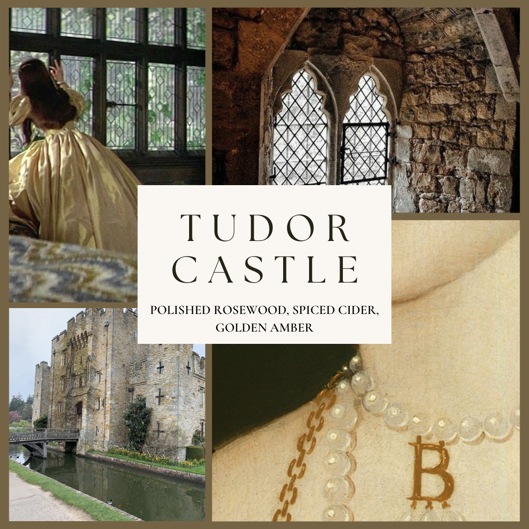 Imagine the storied halls of a Tudor castle, towering oak doors opening into chambers steeped in the rich, earthy aroma of polished rosewood and golden amber, warm glow of candles flickering against stone walls, dancing shadows that whisper of secrets and intrigue, a grand hearth crackling with fire, its heat mingling with the enticing scent of feasts and spiced antique cider, the moors stretching endlessly, cloaked in mist and mystery.