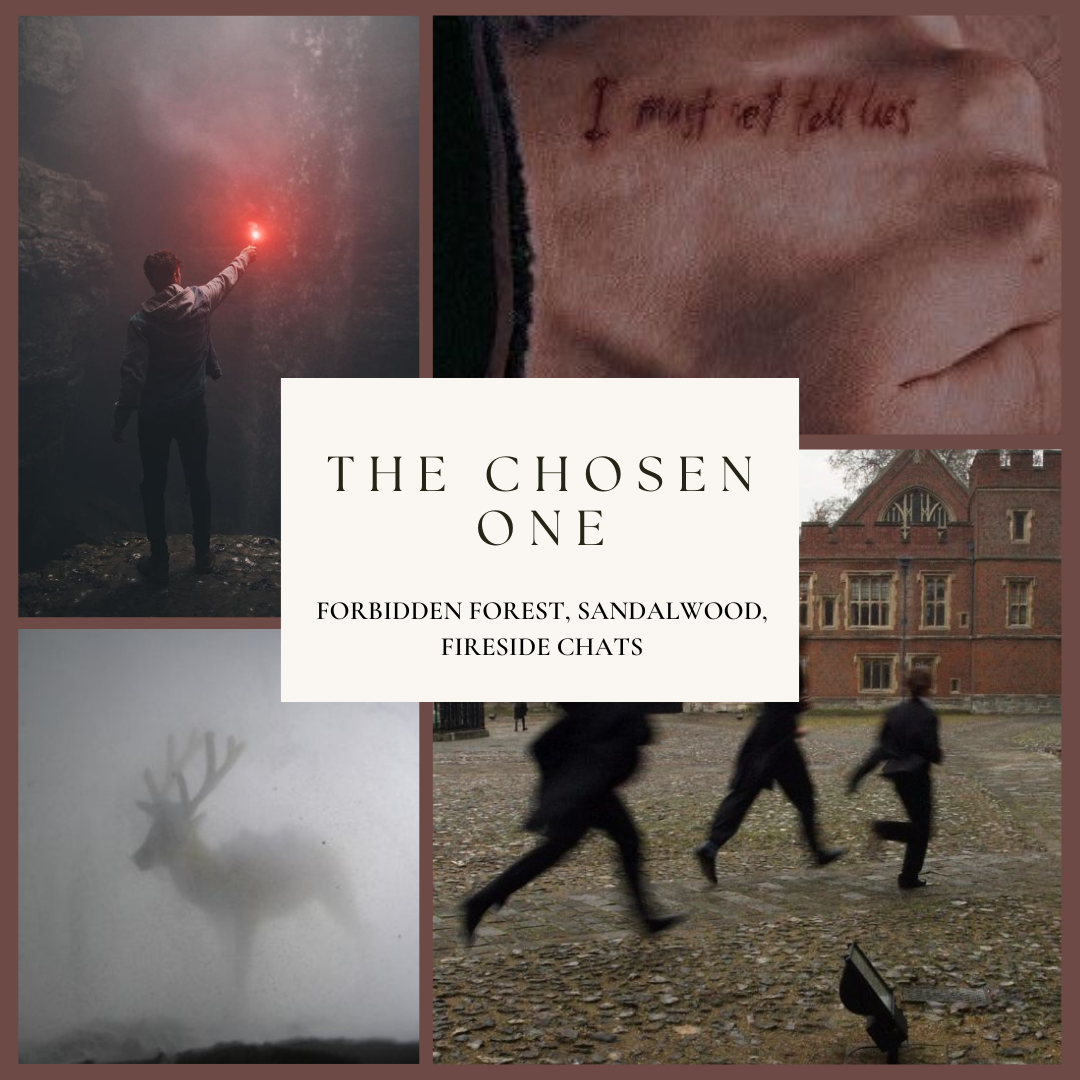 Imagine a Gryffindor spirit glowing bright, its essence rooted in boldness and loyalty, a pair of glasses sitting slightly askew, a lightning bolt-shaped scar telling tales of resilience and destiny, the scent of a fresh broomstick evoking the thrill of flight and freedom, fireside chats with a beloved godfather bringing warmth and wisdom, midnight adventures into the mysterious Forbidden Forest sparking whispers of danger and wonder, a golden trio of friendship, unbreakable and enduring.